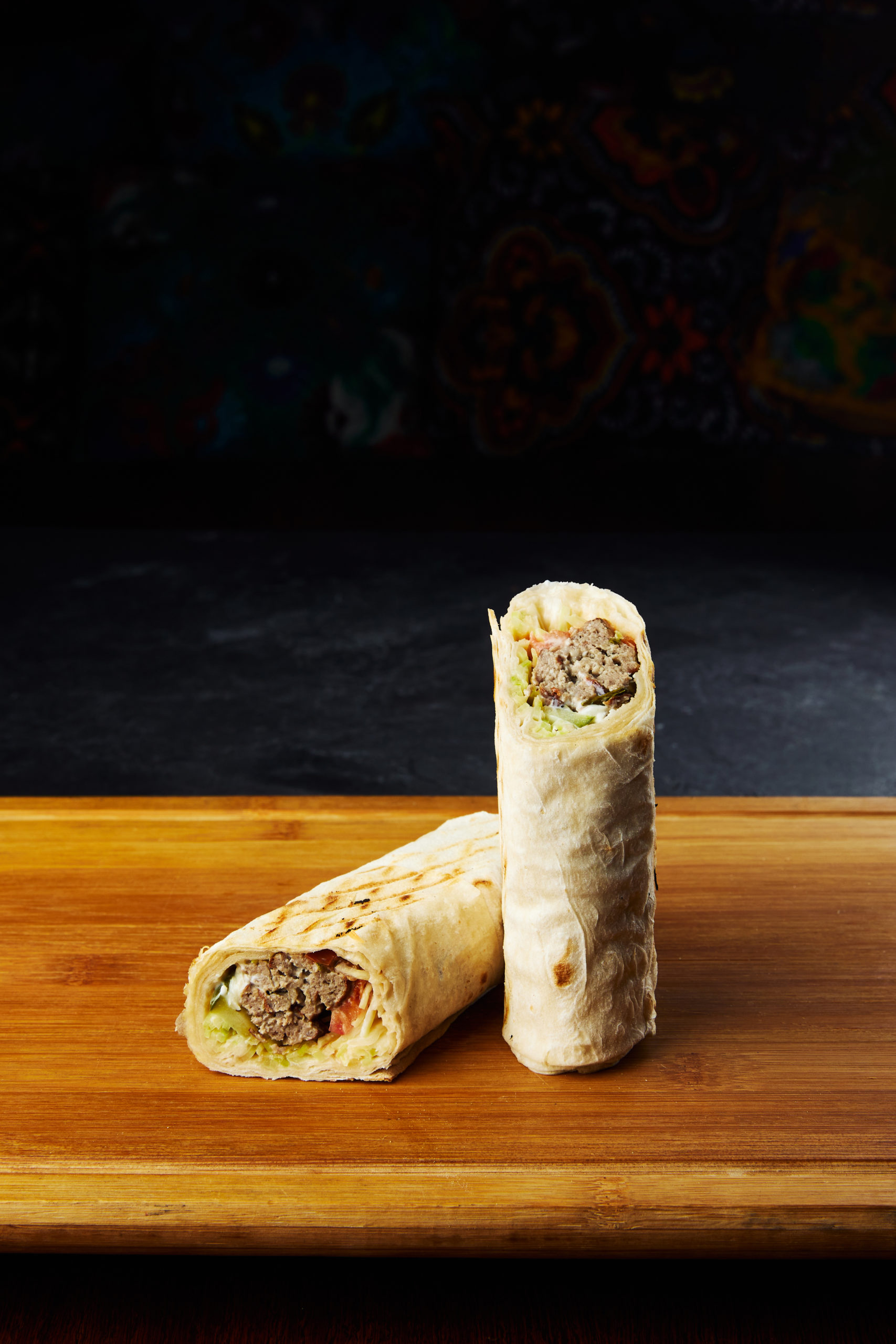 Завернутые в лаваш кусочки баранины со свежей капустой, помидором, огурцом и фирменным соусом. Обжаривается на гриле.