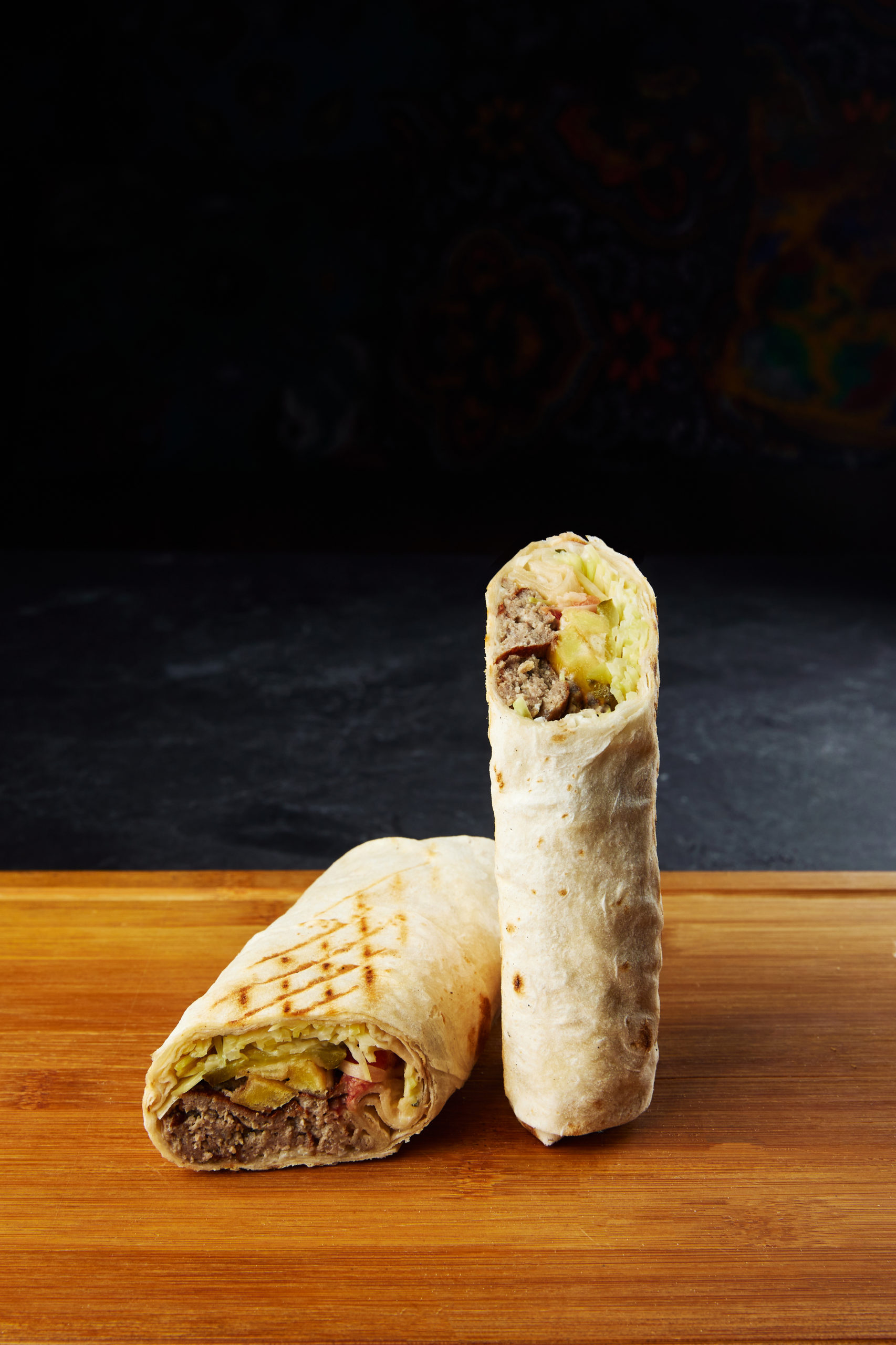 Завернутые в лаваш кусочки баранины со свежей капустой, соленым огурцом, свежим помидором, картофелем фри и фирменным соусом. Обжаривается на гриле.